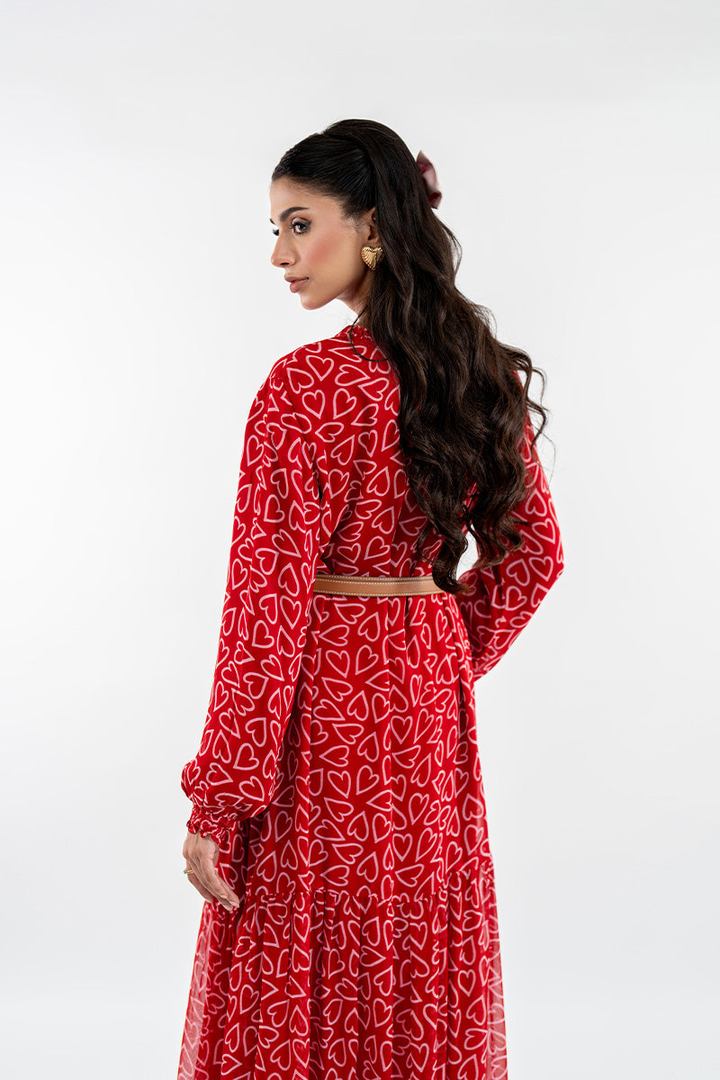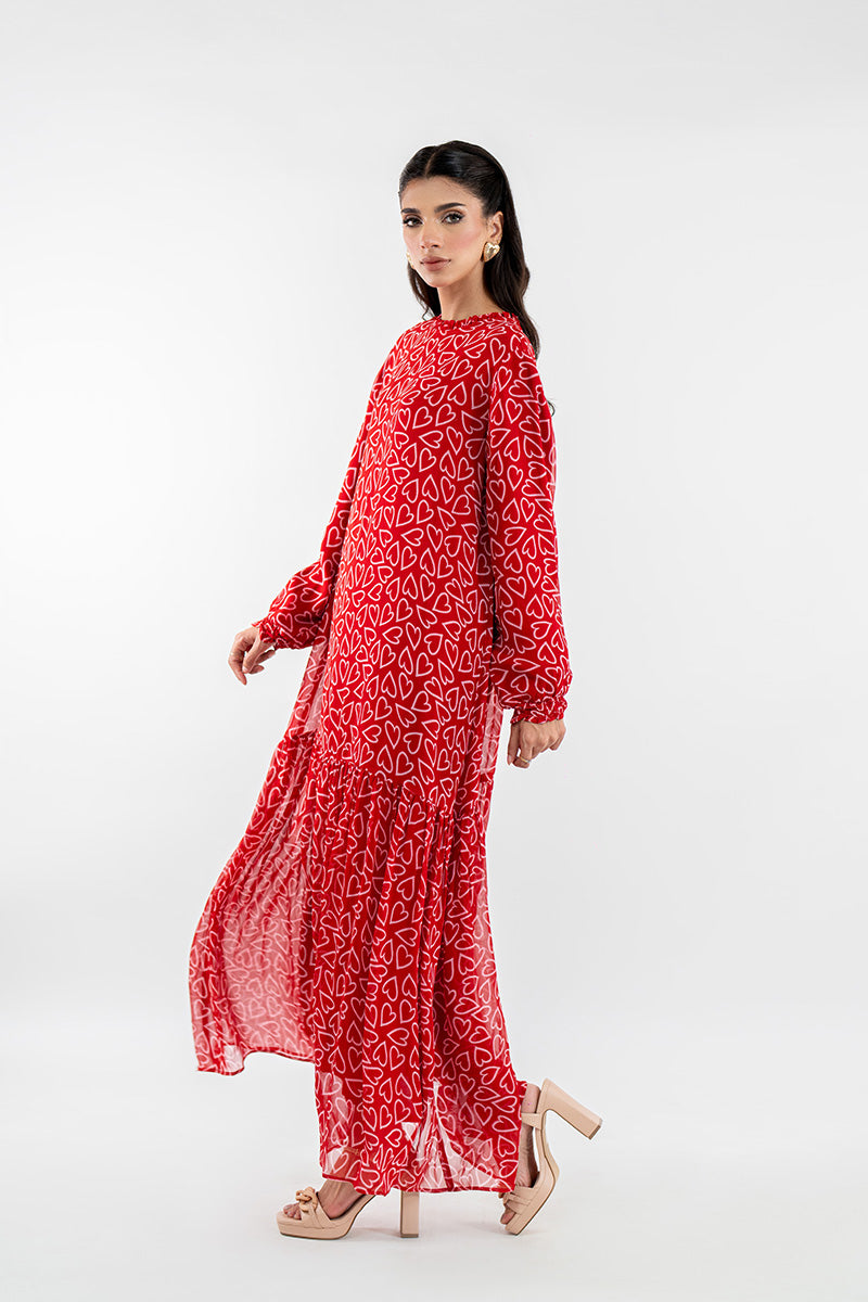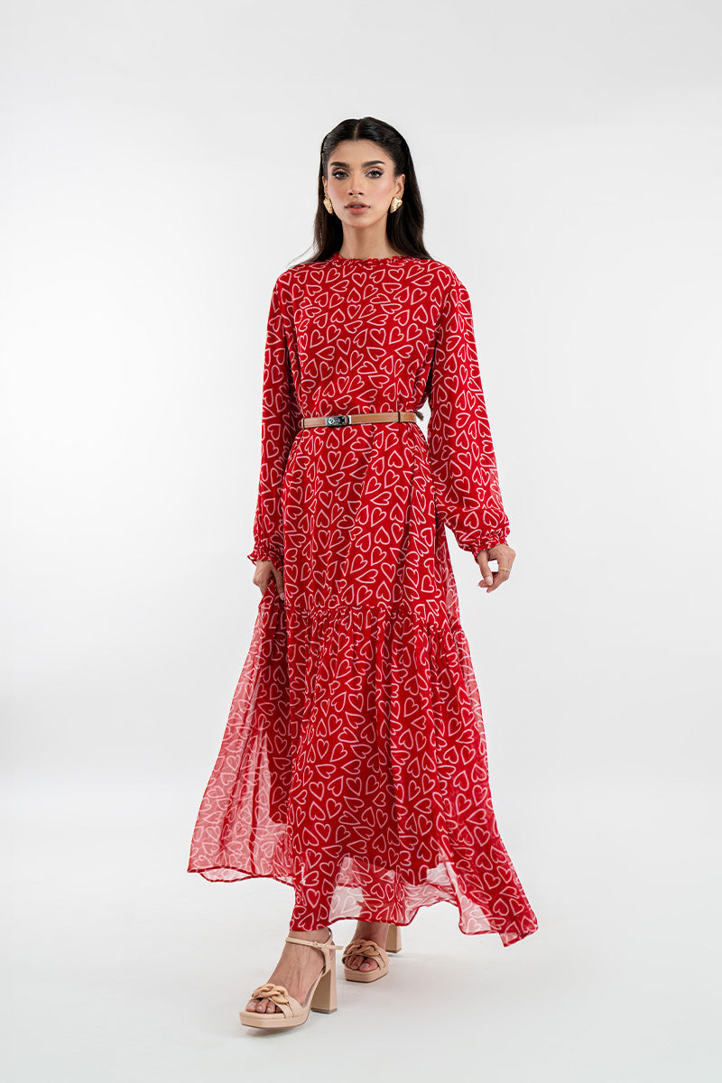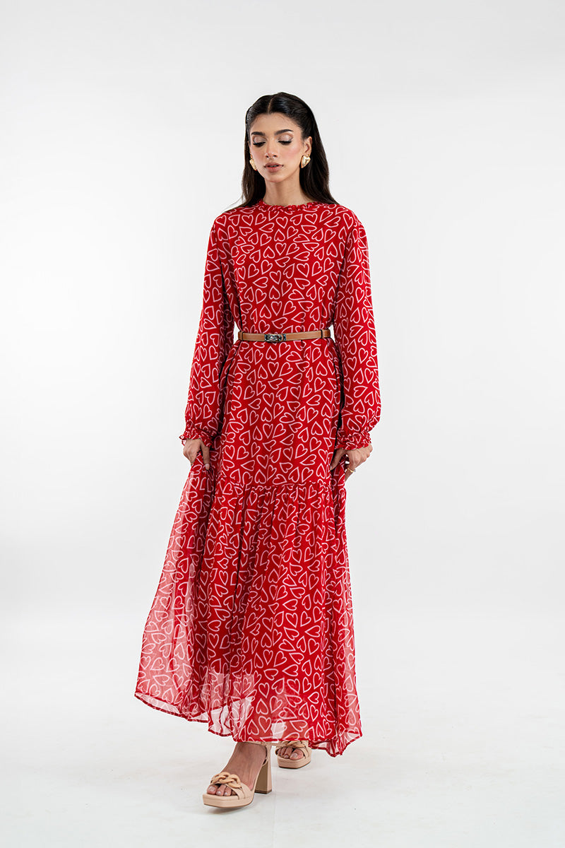 This is the dress called Adore Me you'll reach for when you want to look effortlessly chic without trying too hard. The vibrant ruby-red is covered in a playful white heart print, making a statement that’s bold yet completely charming. With its breezy, tiered maxi silhouette and graceful long sleeves, it offers beautiful coverage and beautiful movement.