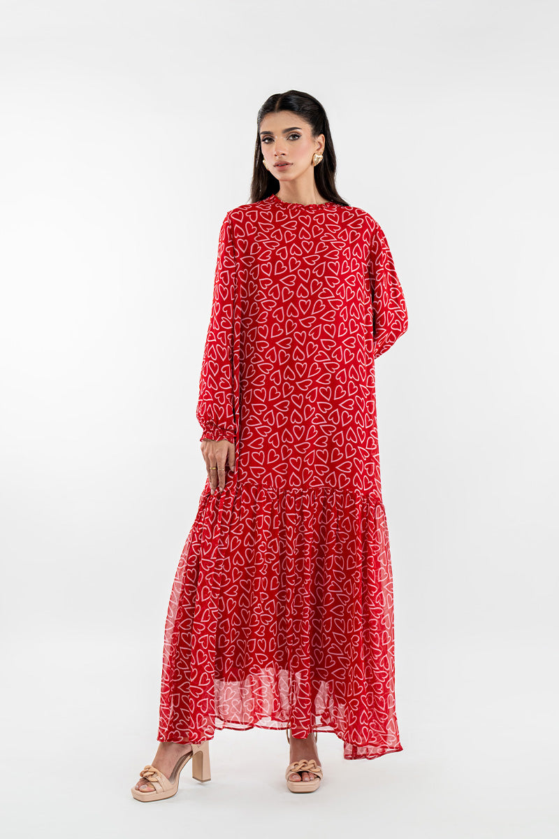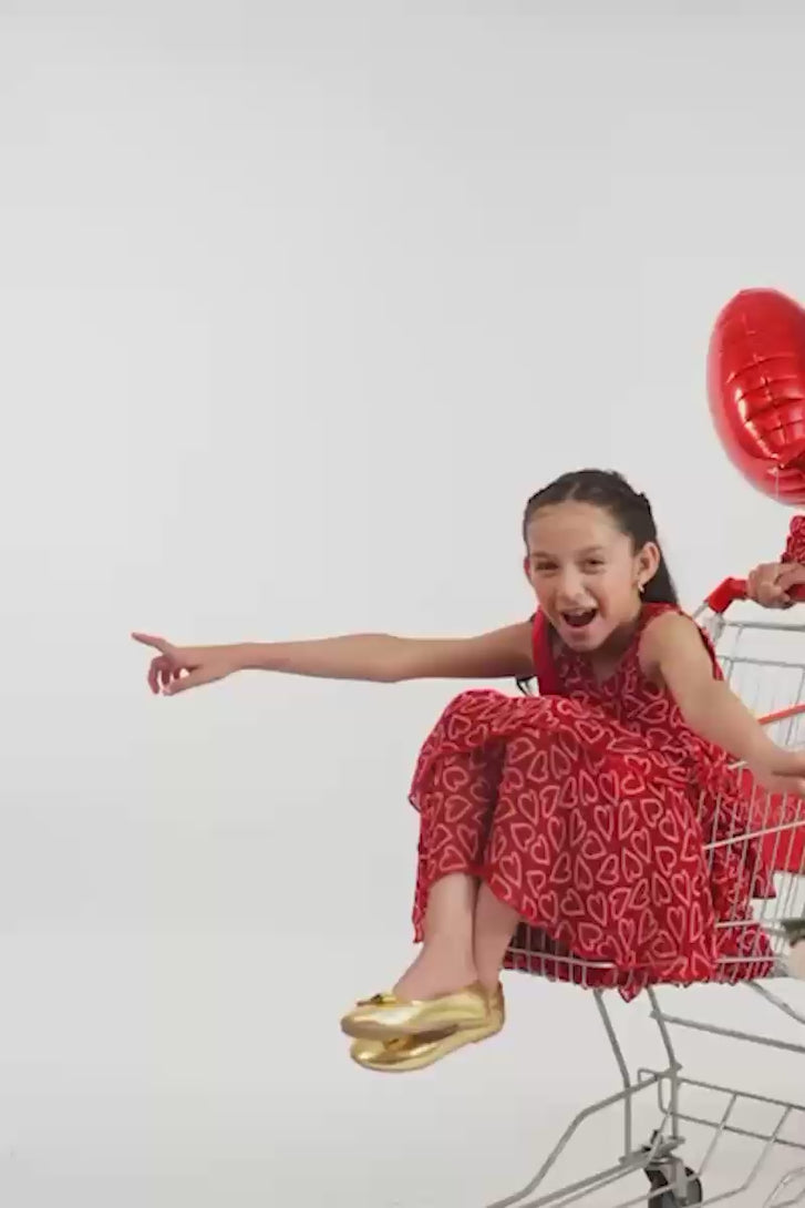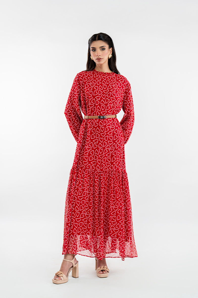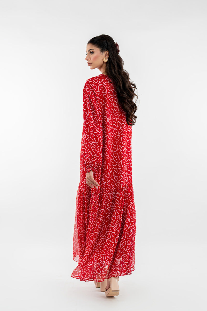 This is the dress called Adore Me you'll reach for when you want to look effortlessly chic without trying too hard. The vibrant ruby-red is covered in a playful white heart print, making a statement that’s bold yet completely charming. With its breezy, tiered maxi silhouette and graceful long sleeves, it offers beautiful coverage and beautiful movement.