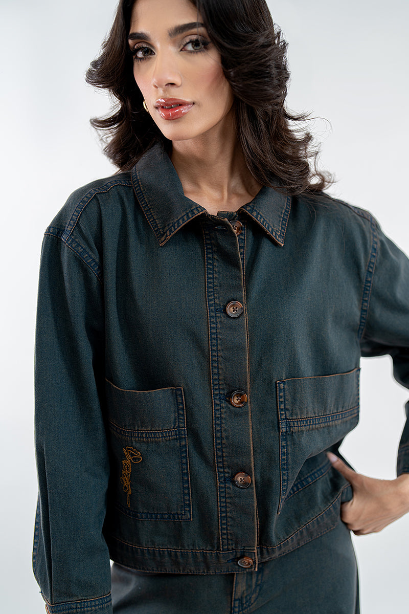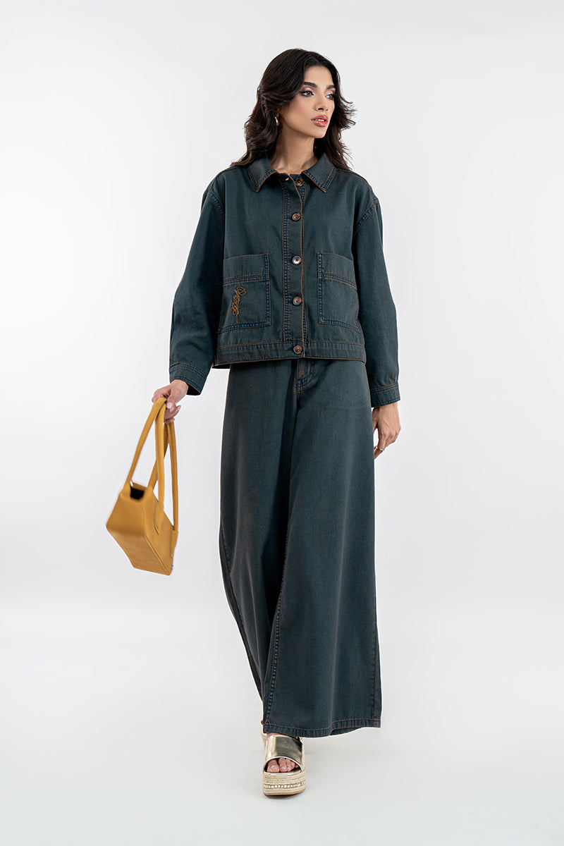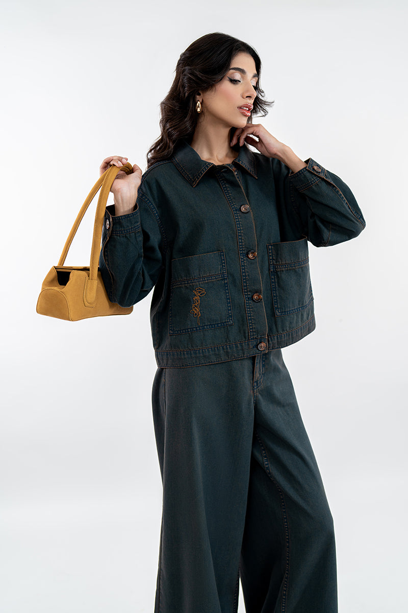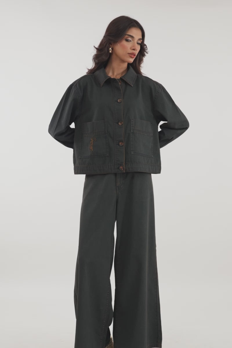 The Charcoal Calm Shirt is a dark, muted gray denim jacket-style top. It features a cropped, boxy silhouette with a classic collar and full sleeves. The front is detailed with contrasting rust-colored buttons and visible stitching that forms a quilted pattern across the body, offering a structured, contemporary monochrome look when paired with its matching wide-leg trousers.