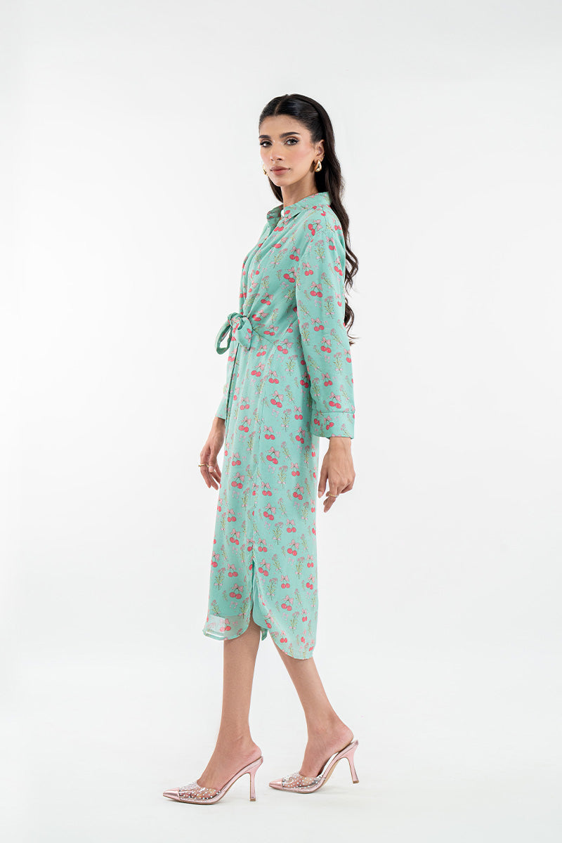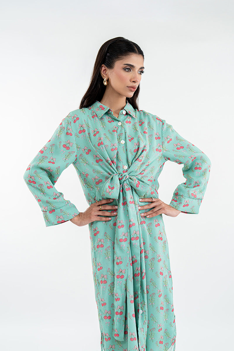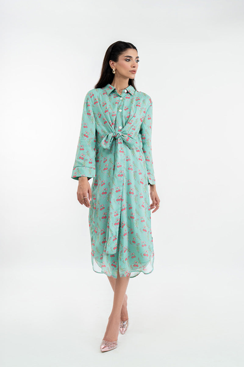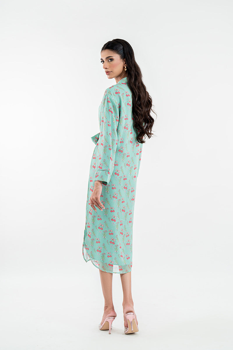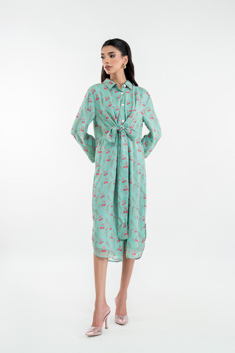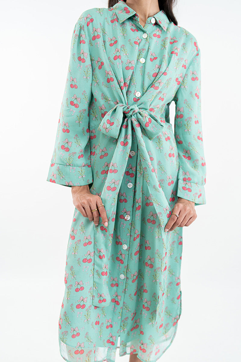 The Cherry Kiss shirtdress. This piece brings a fresh, playful twist to classic style with its soft mint green hue adorned with delicate pink cherries. Designed for comfort and versatility, it features a relaxed button-down silhouette that can be worn flowing, cinched, or tied at the waist for a chic, effortless look.