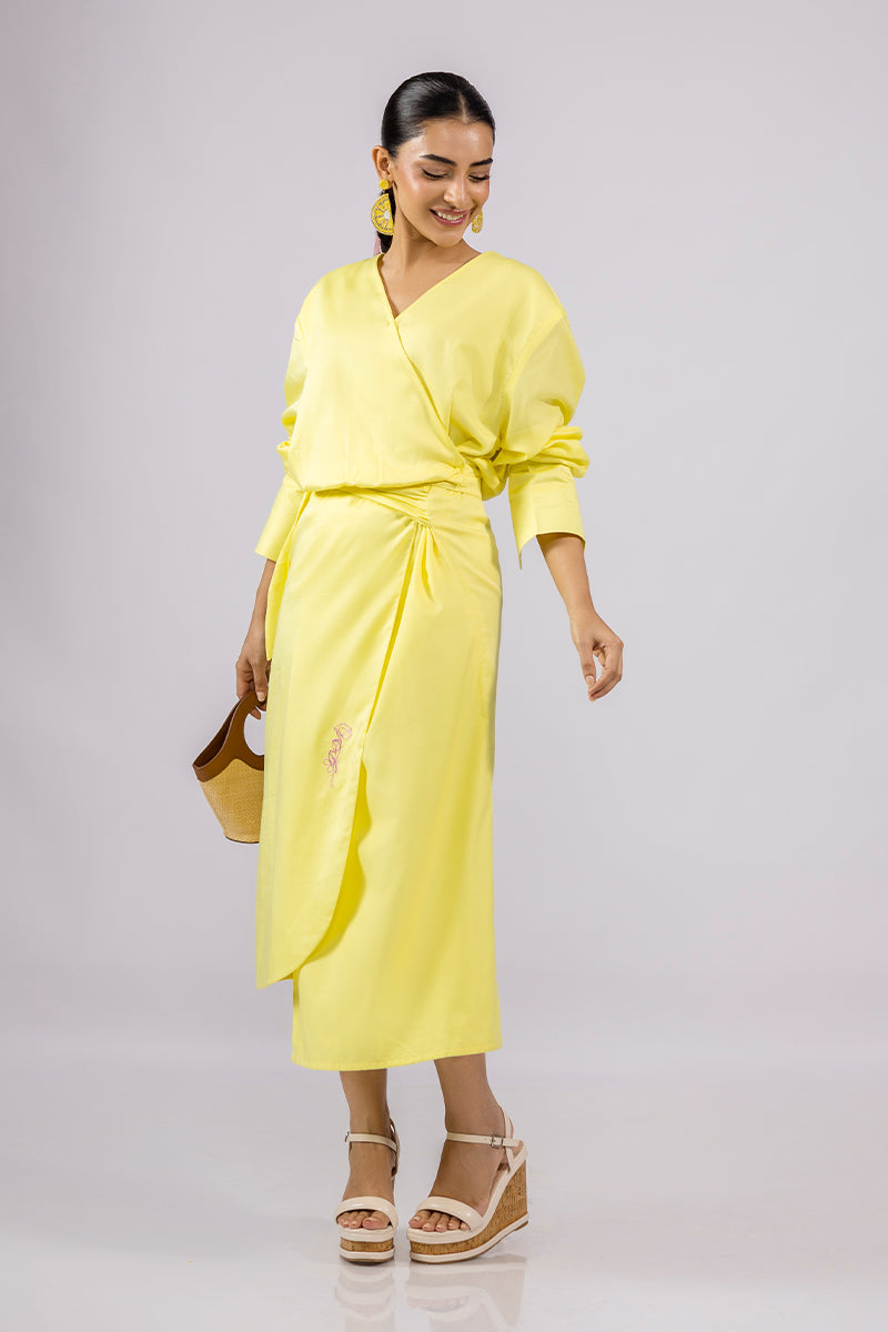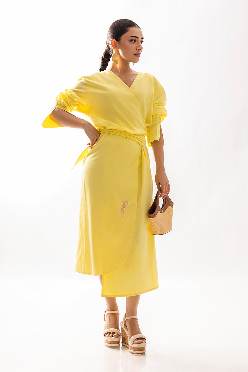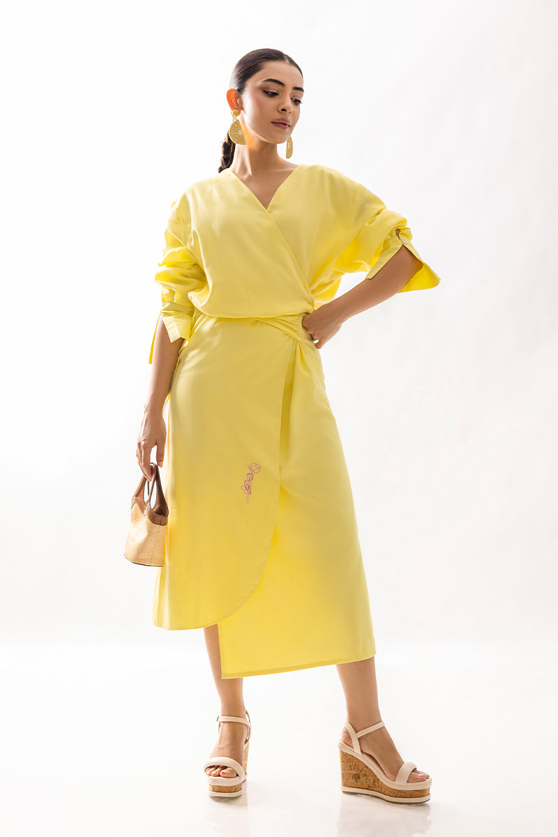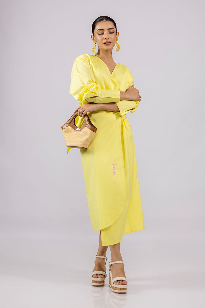 Add a splash of sweet sunshine to your wardrobe with our "must-have" Citrus glow dress! Crafted from incredibly soft and luxurious cotton satin, this modern-chic piece is as comfy as it is captivating. Its clever wrap style creates a beautiful silhouette, while the cheerful yellow color and delicate drape give it a fresh, charming appeal. Get ready to feel utterly adorable and perfectly polished all at once!