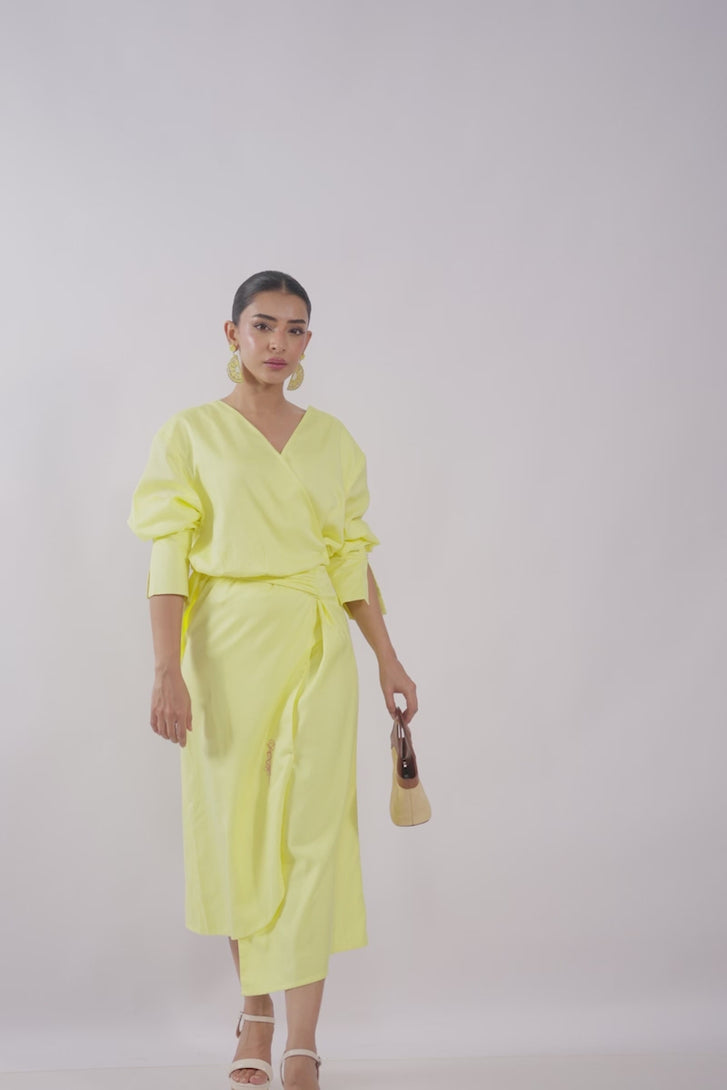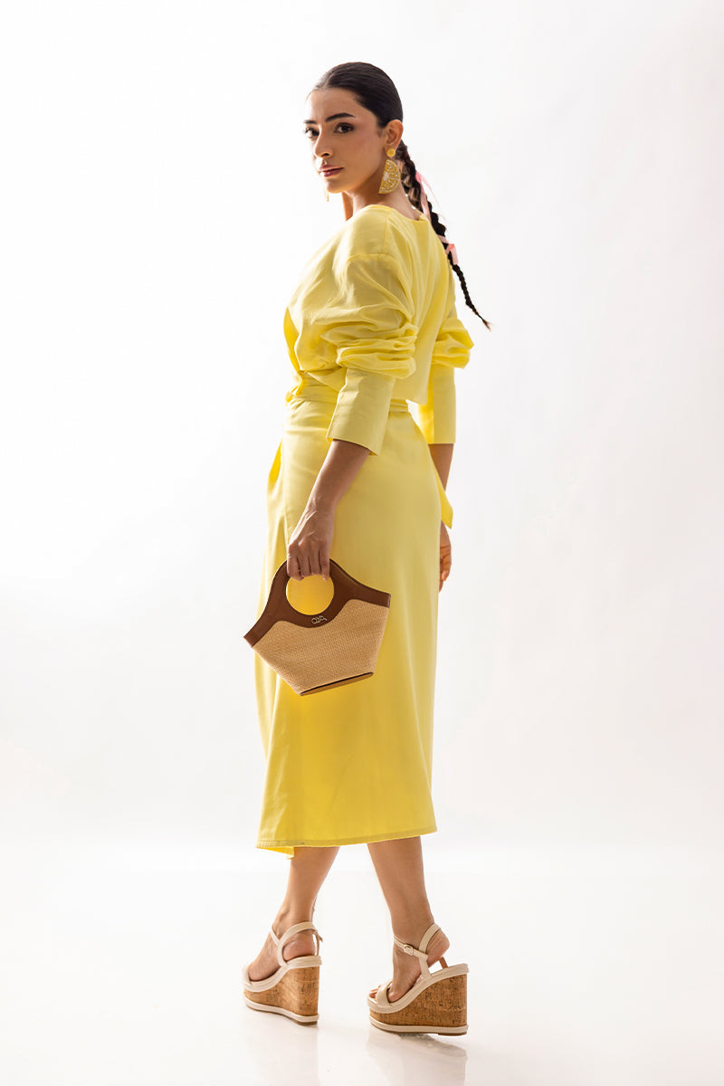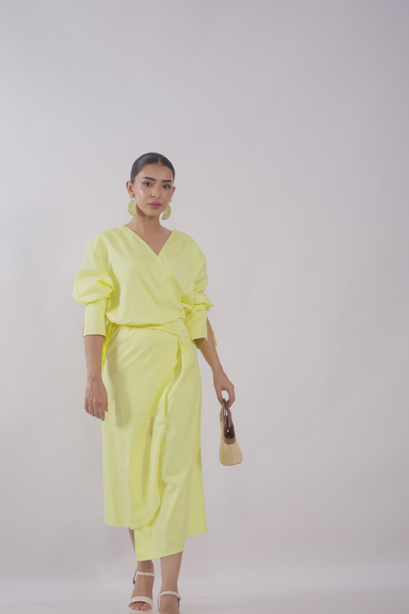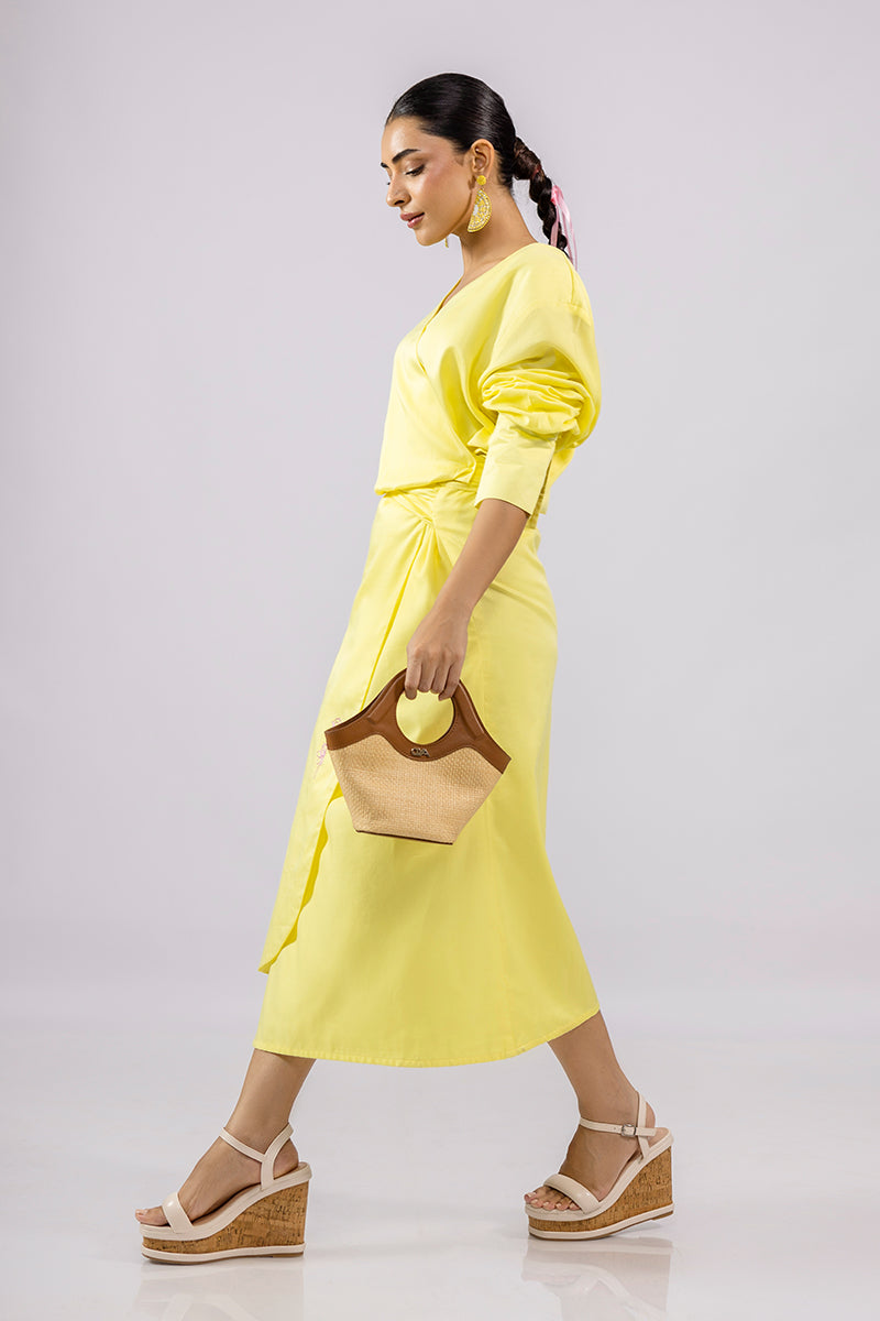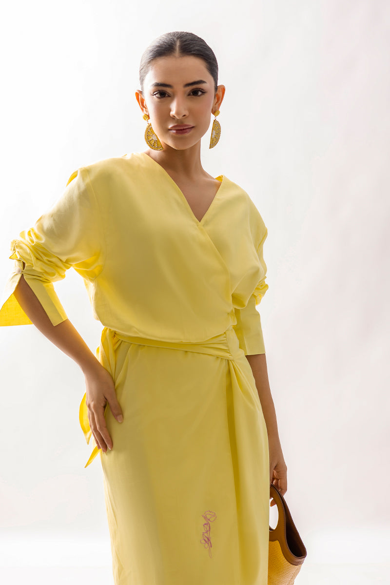 Add a splash of sweet sunshine to your wardrobe with our "must-have" Citrus glow dress! Crafted from incredibly soft and luxurious cotton satin, this modern-chic piece is as comfy as it is captivating. Its clever wrap style creates a beautiful silhouette, while the cheerful yellow color and delicate drape give it a fresh, charming appeal. Get ready to feel utterly adorable and perfectly polished all at once!
