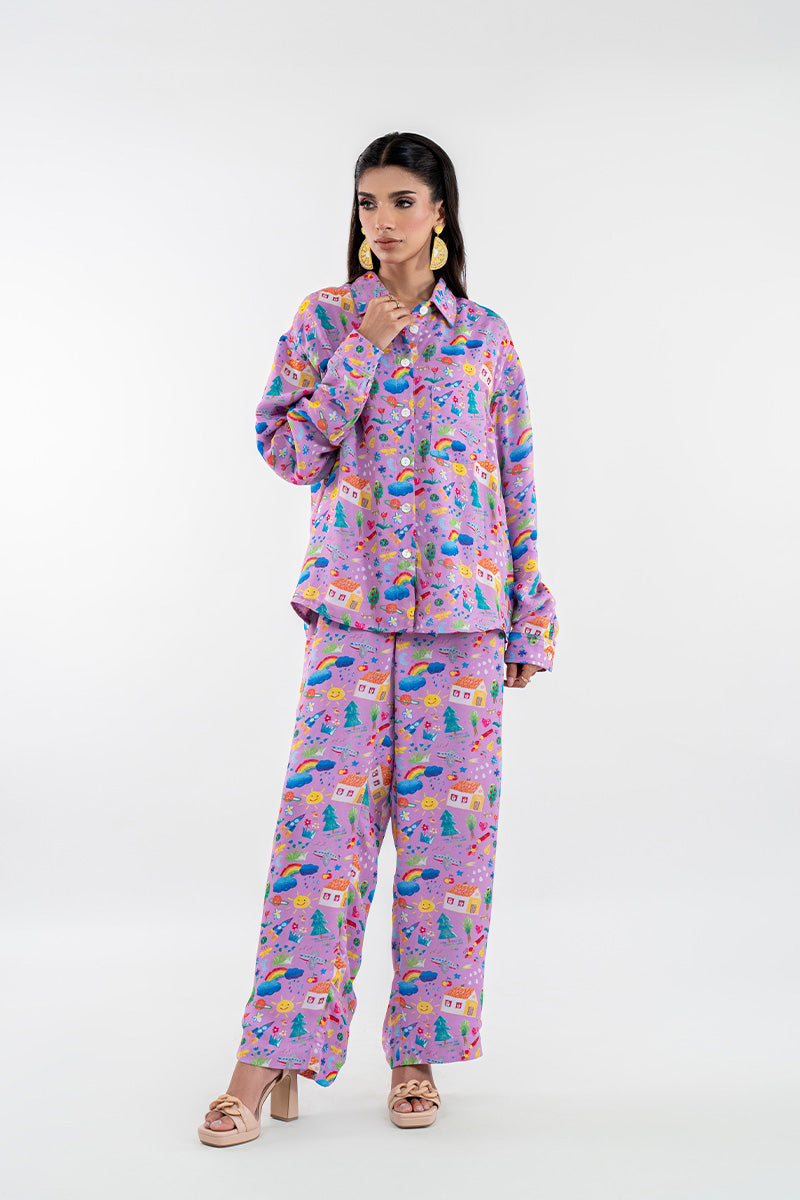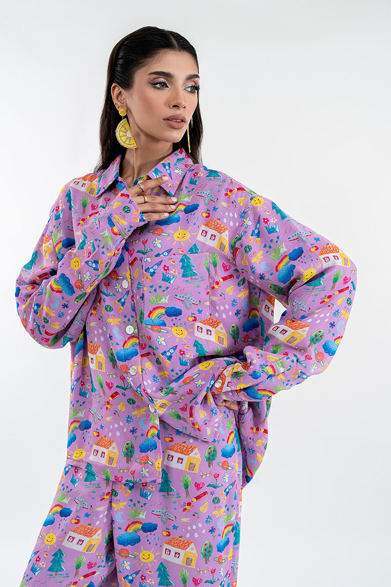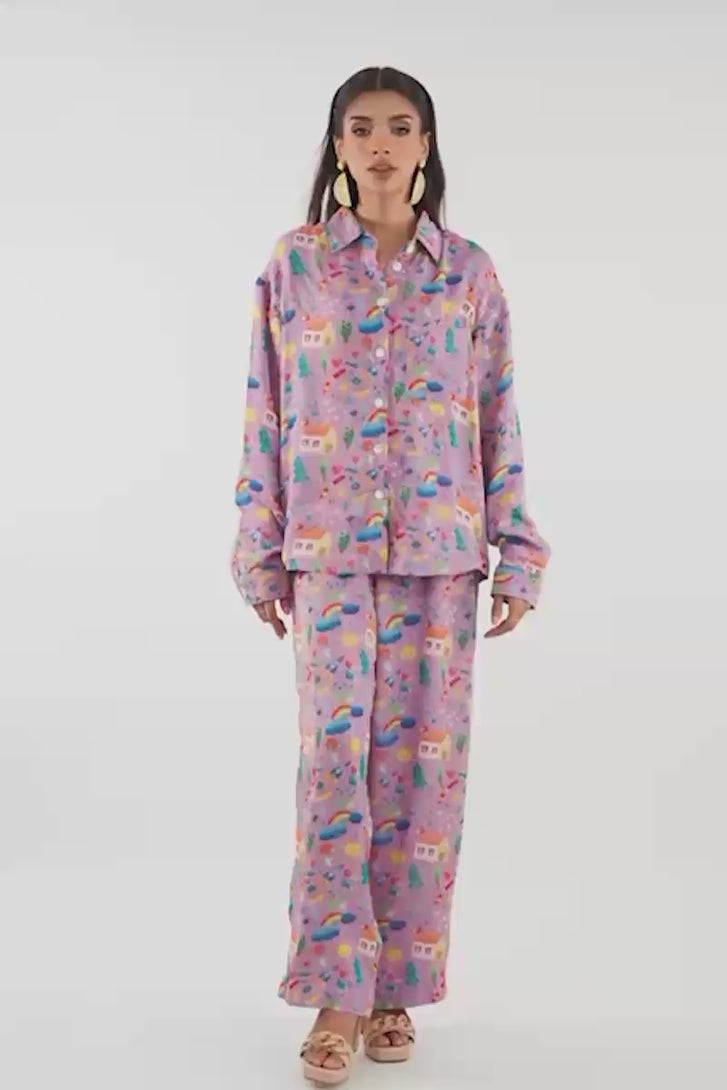 The Dreamland Doodles shirt is a full-sleeved, collared button-up top, cut in a relaxed, straight silhouette, typical of comfortable pajama wear. It is made from a lightweight fabric and features a vibrant all-over print on a soft lavender or lilac base color. The print itself consists of small, scattered abstract or whimsical motifs in various bright colors like blue, yellow, red, and turquoise, giving it a playful, cheerful aesthetic. The shirt is designed to be worn untucked, with a casual, flowing fit.