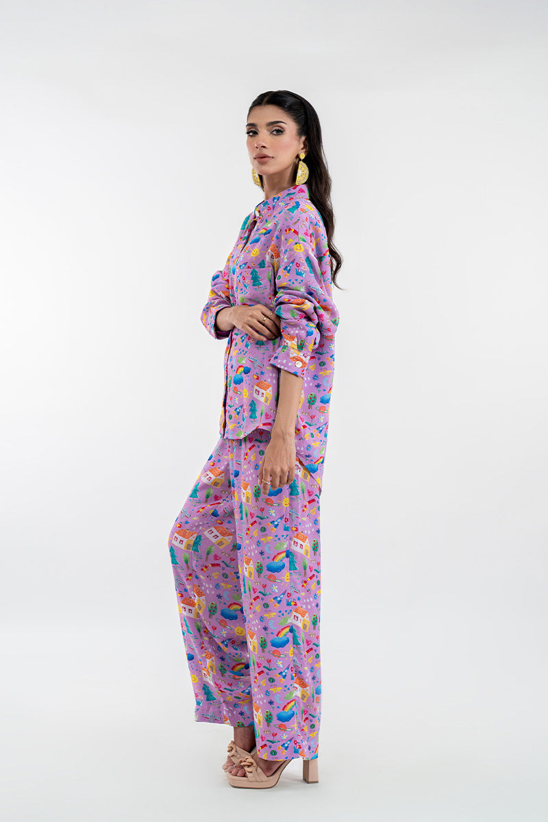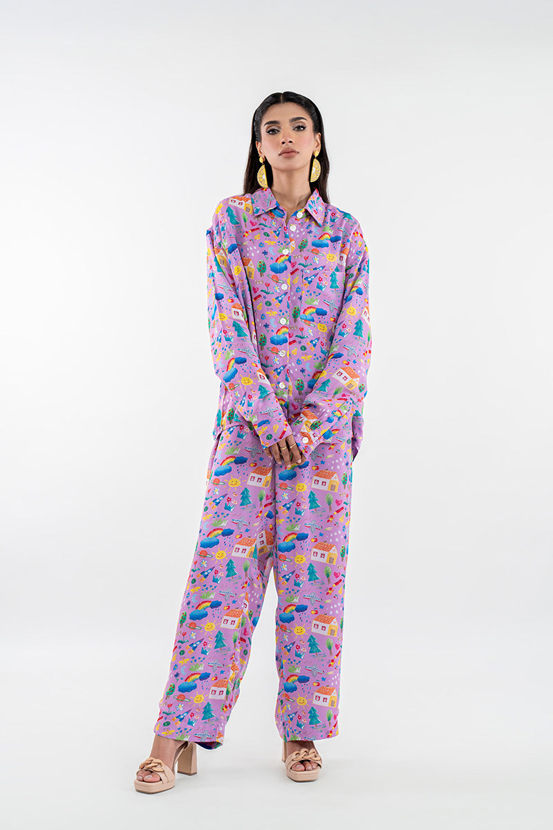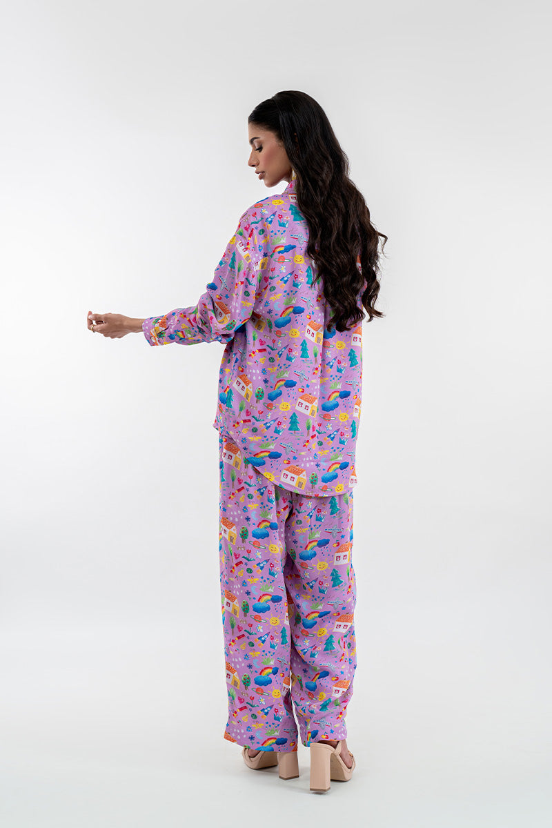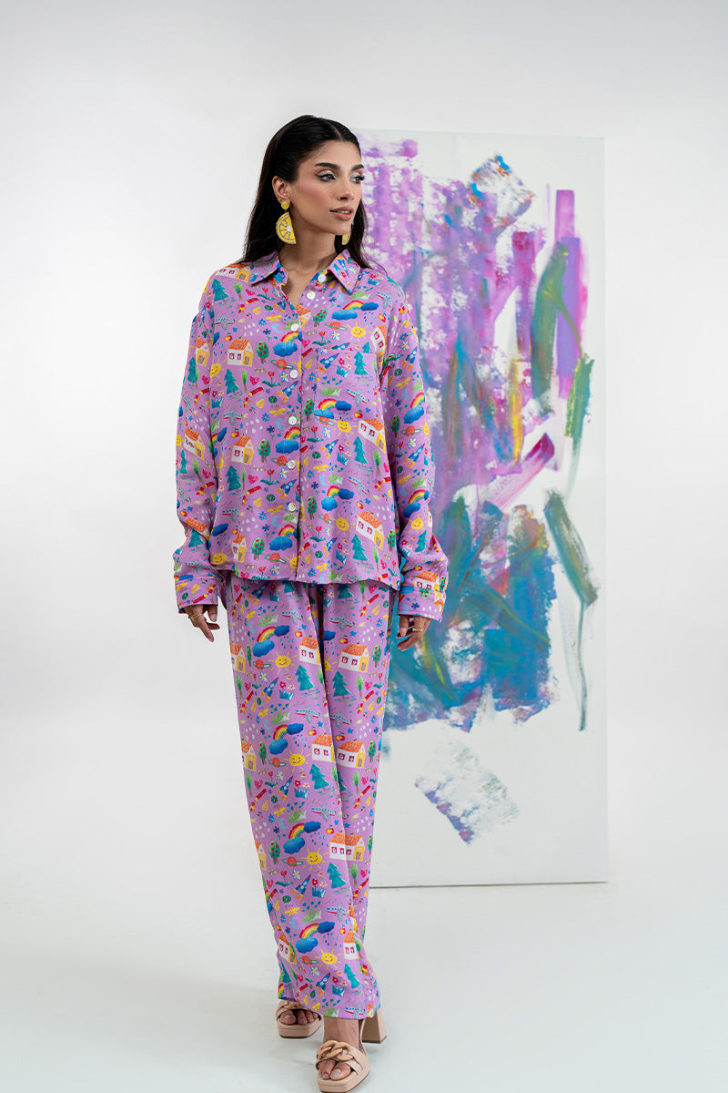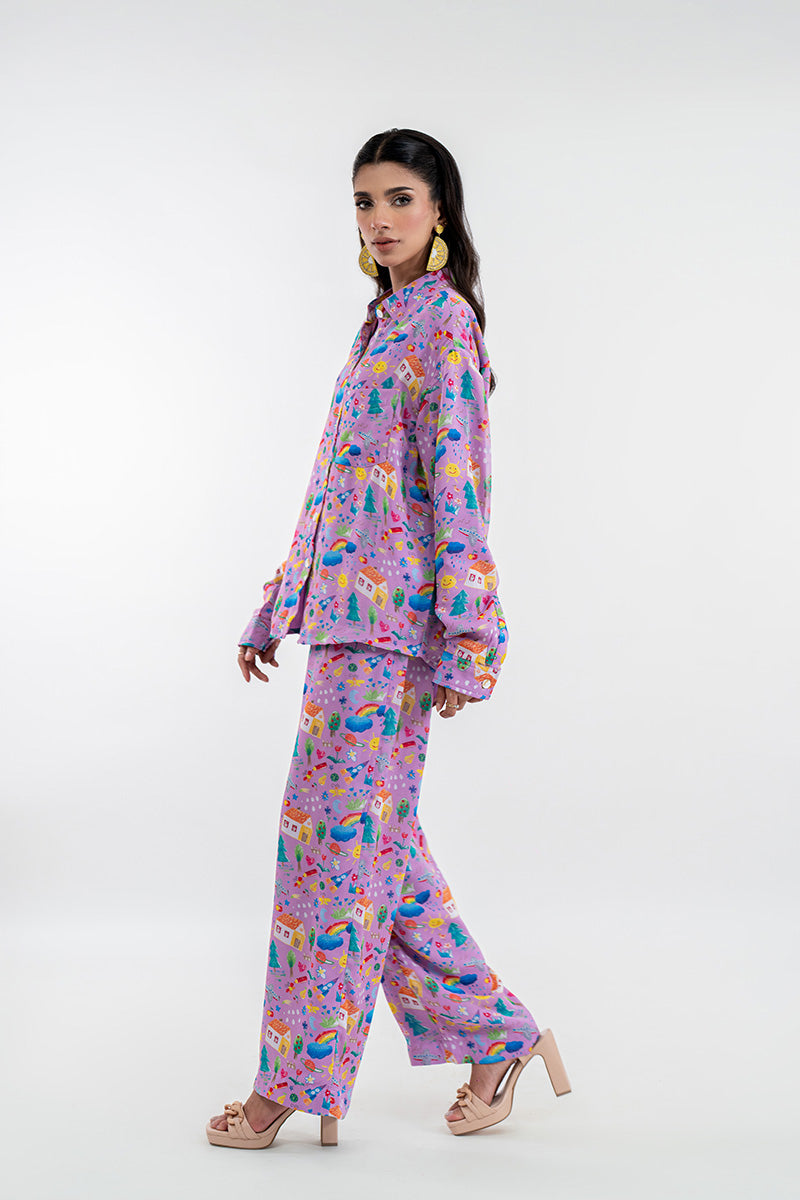 The Dreamland Doodles pants are designed to match the shirt perfectly, made from the same lavender-based, whimsically printed fabric. They have a straight-leg, relaxed fit that provides ease of movement. The high-waisted design and the flow of the material suggest comfort. Like the shirt, the pants are fully covered in the bright, scattered motifs, creating a cohesive, eye-catching, and comfortable loungewear or leisure suit ensemble.