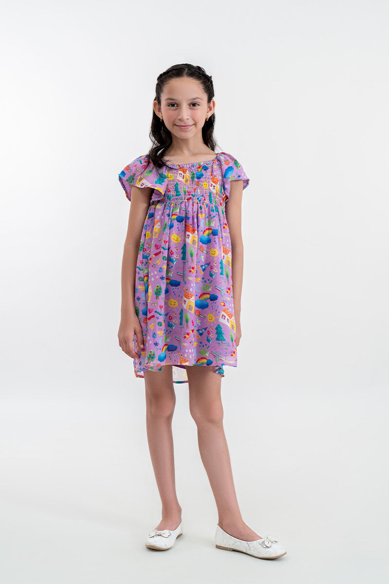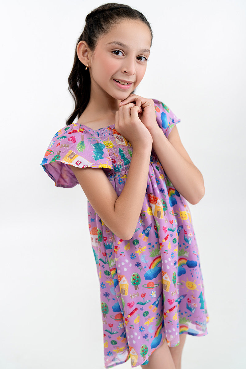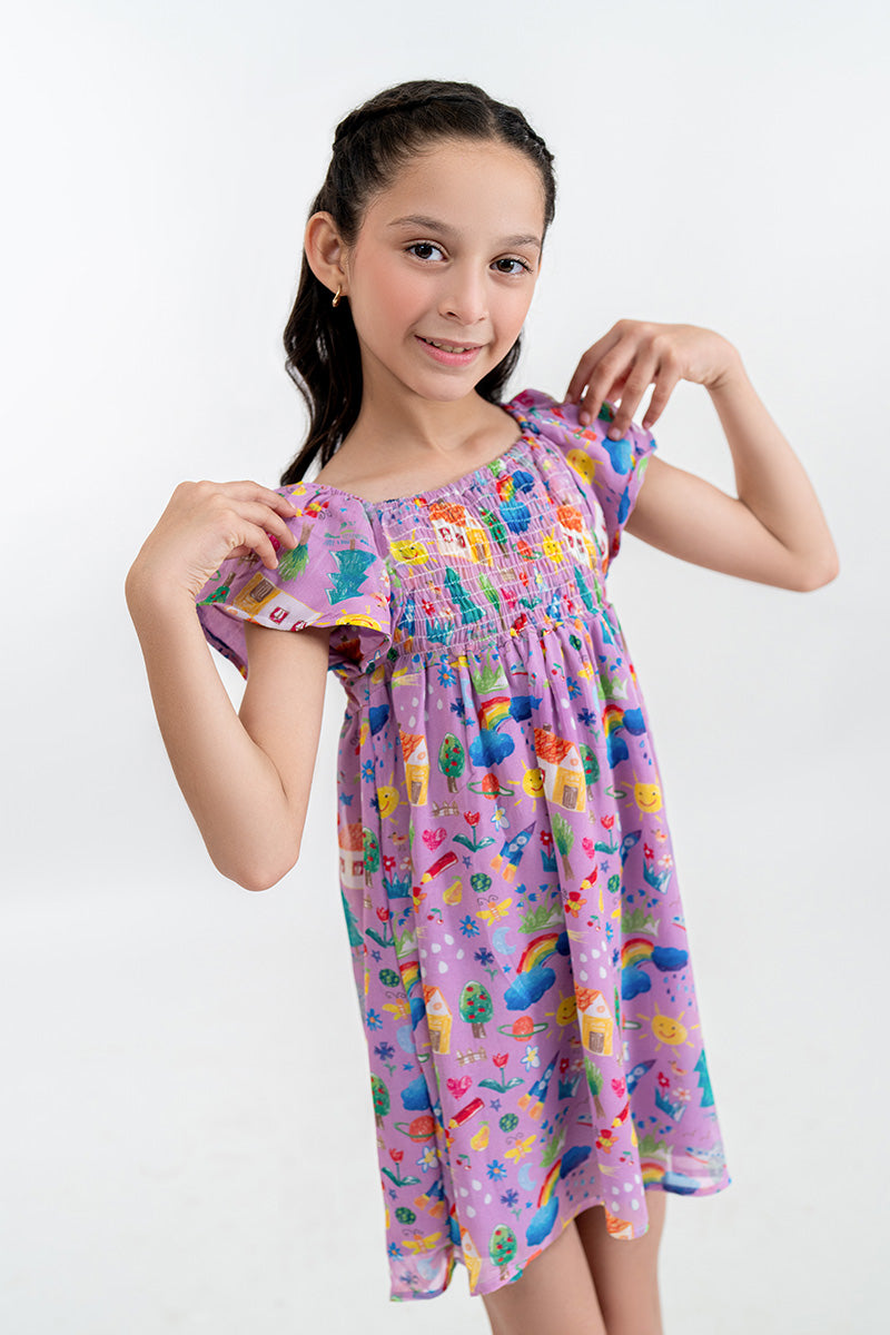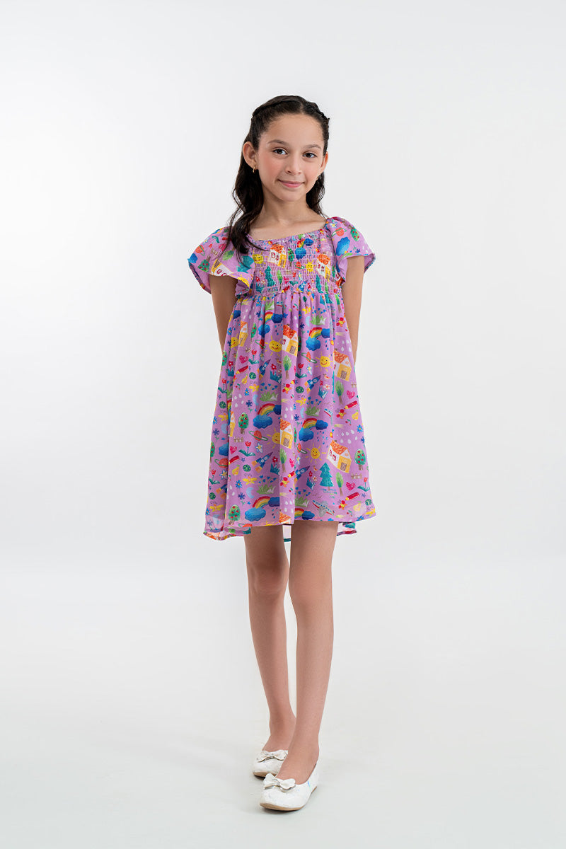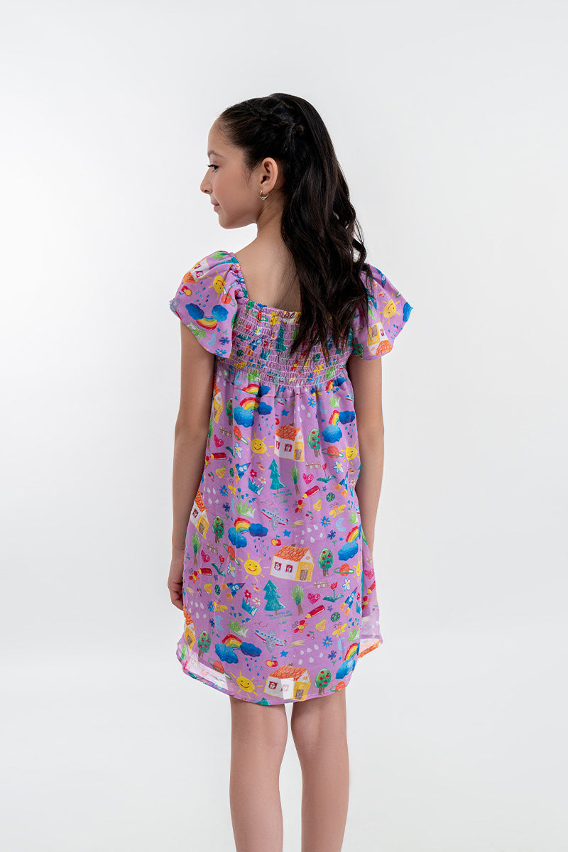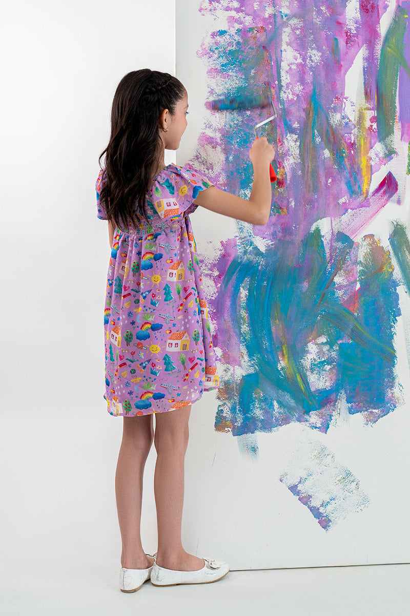 The Dreamland Doodles dress is covered in a delightful, colorful print a miniature world of houses and rainbows that sparks imagination. It features an adorable, smocked bodice for a comfortable, flexible fit and light, flutter sleeves perfect for sunny days. The breezy, full skirt is ready for every jump, skip, and spin.
