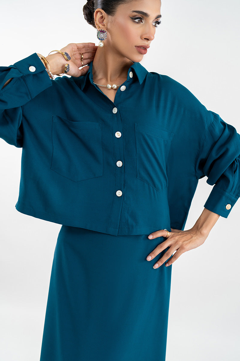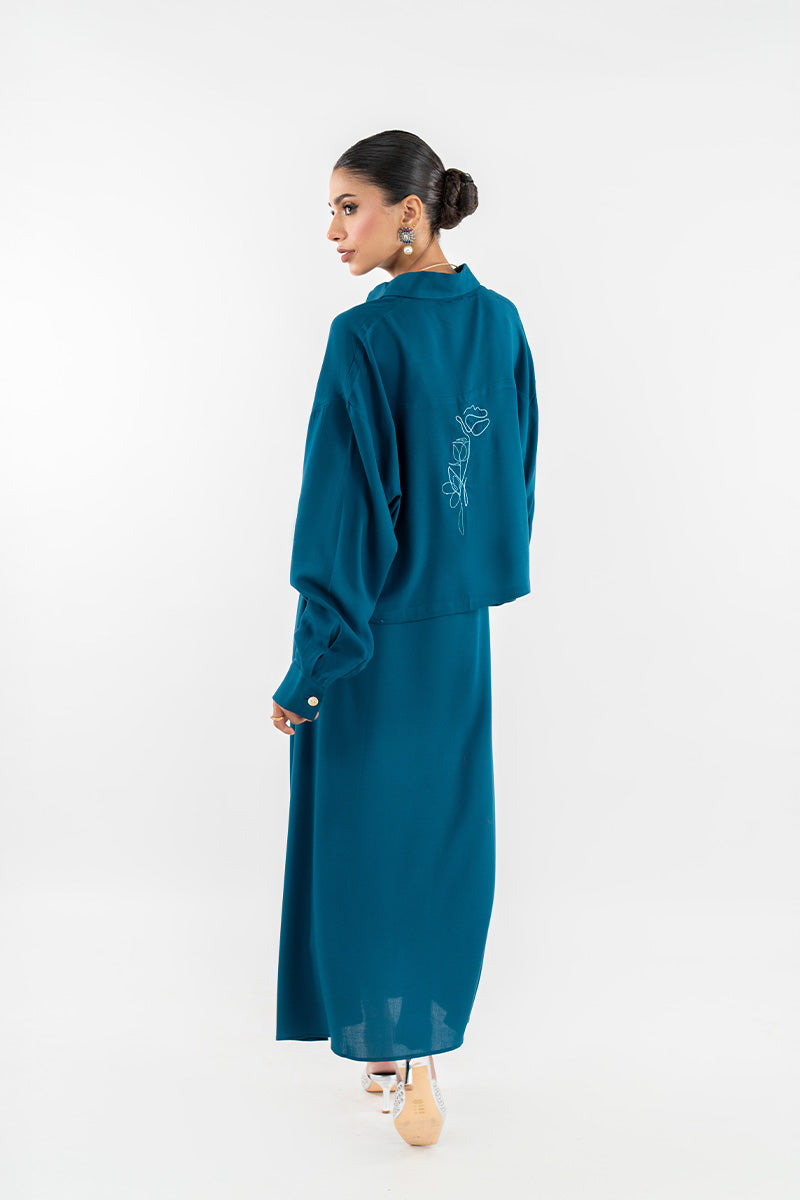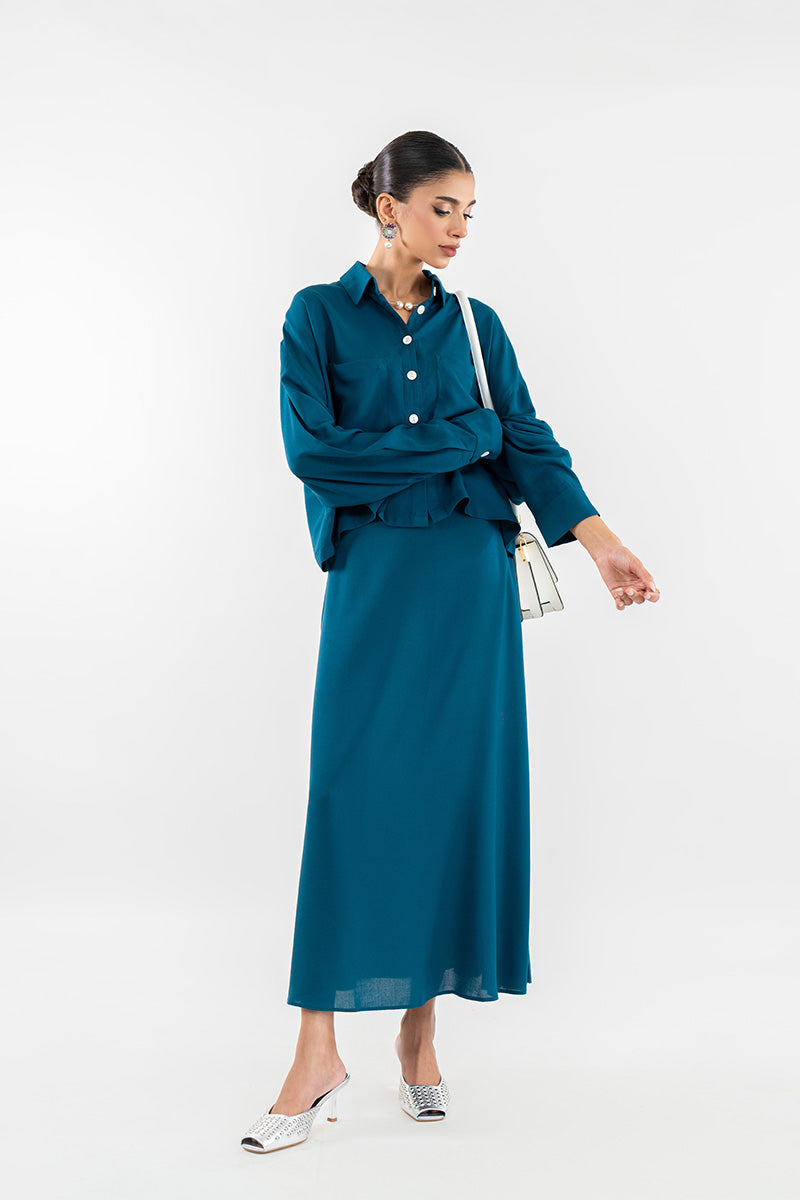 The skirt is a long, streamlined piece in the matching Falling for Teal ecovero fabric. It features an elegant, straight cut that falls to the ankle. The ecovero fabric ensures a smooth, graceful drape and sophisticated movement, completing the cohesive set.
