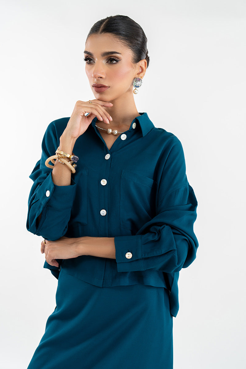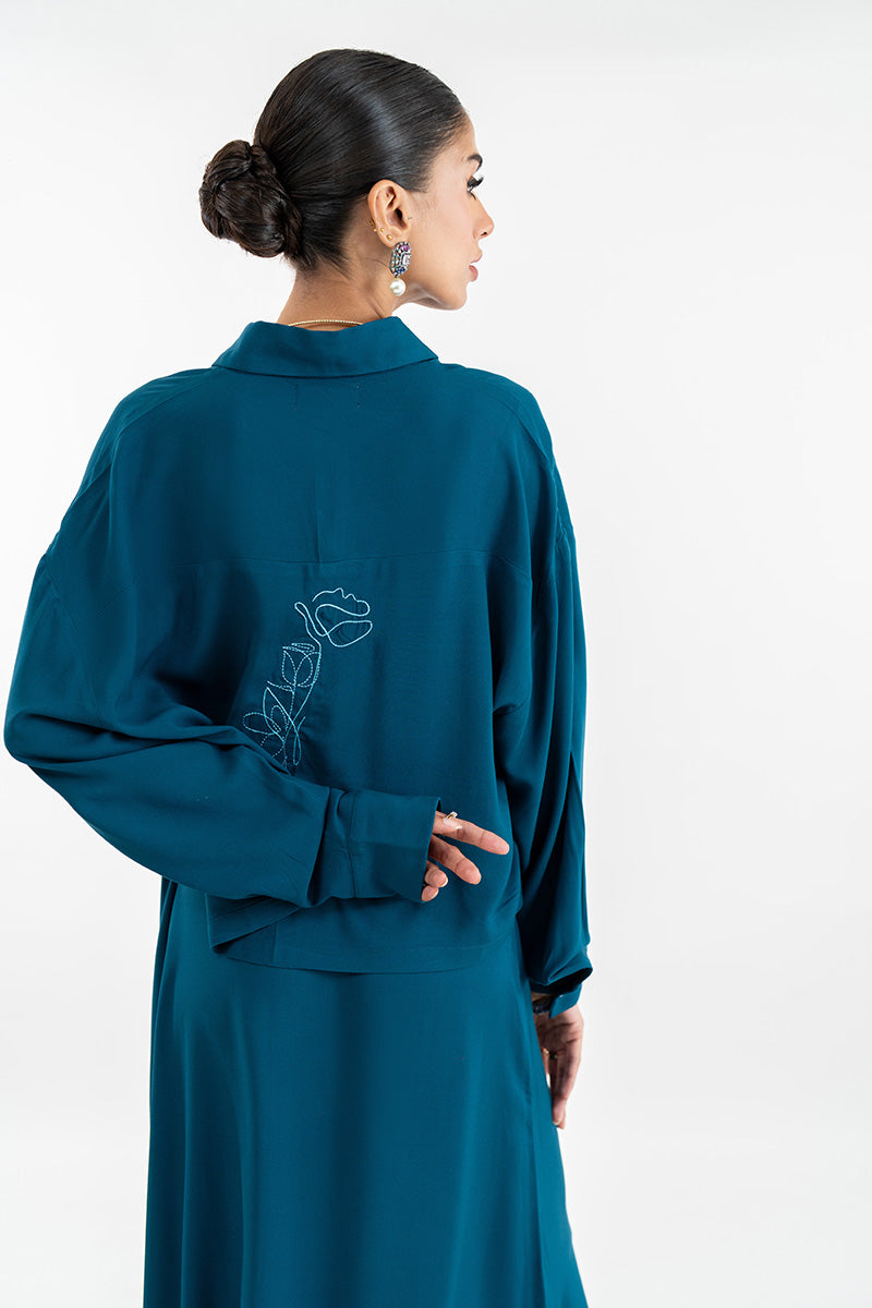 The skirt is a long, streamlined piece in the matching Falling for Teal ecovero fabric. It features an elegant, straight cut that falls to the ankle. The ecovero fabric ensures a smooth, graceful drape and sophisticated movement, completing the cohesive set.