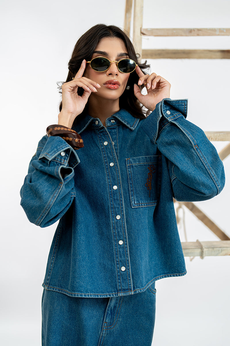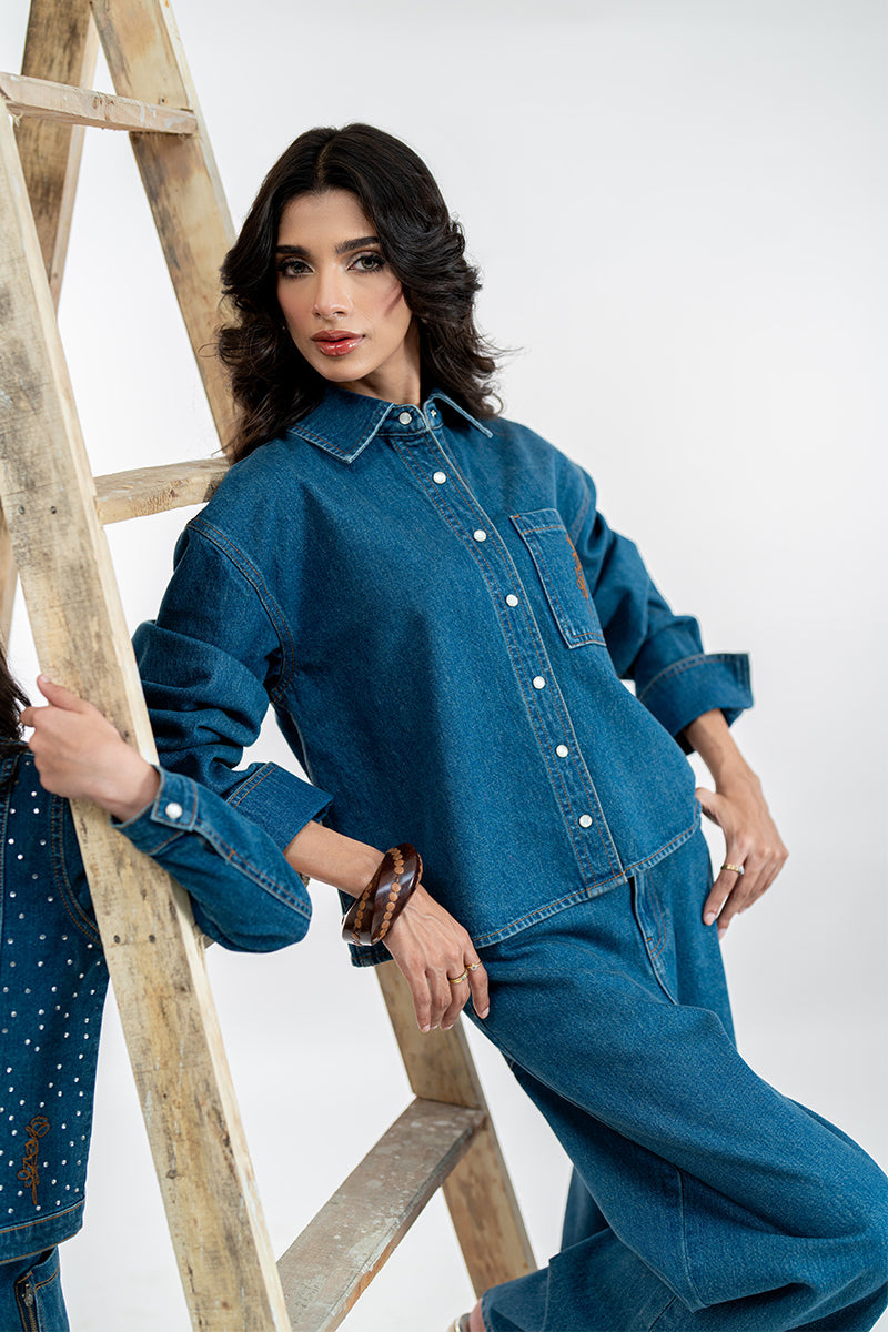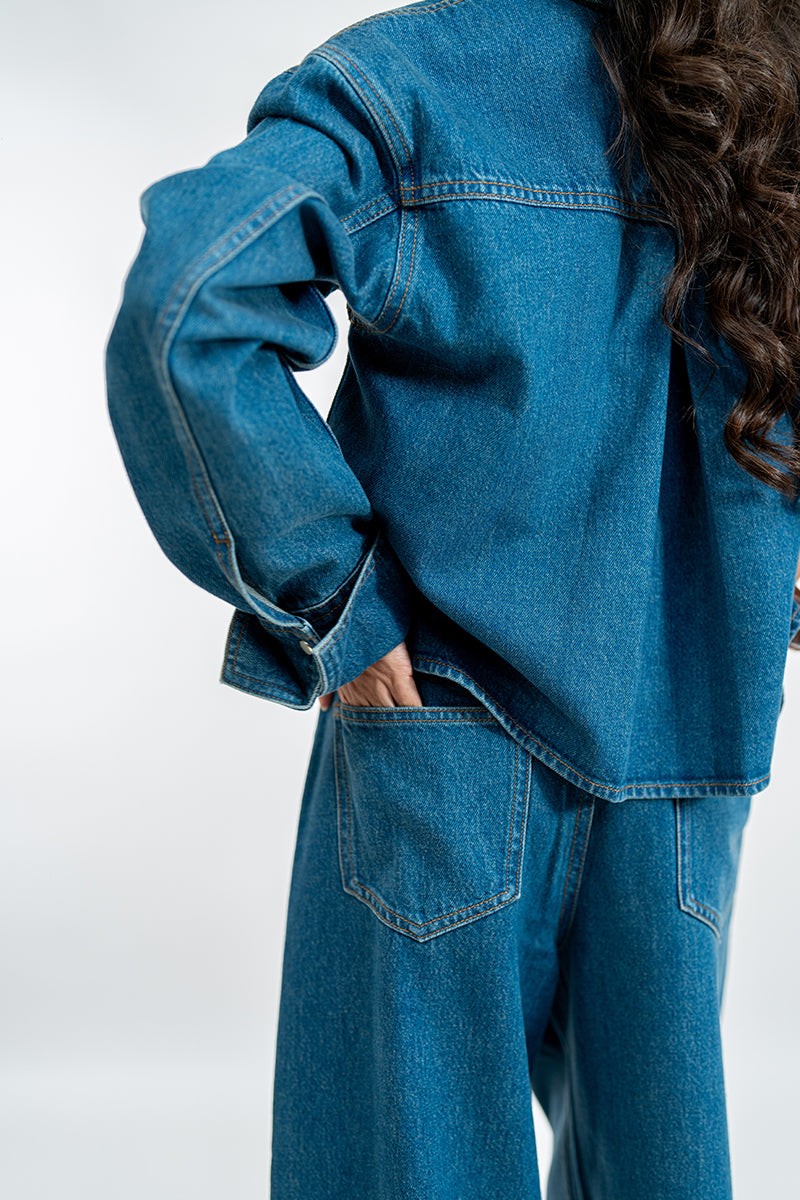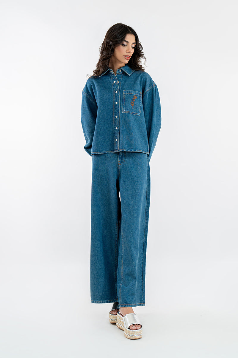 The Midnight Dune denim pants are high-waisted, wide-leg trousers crafted from a medium-wash blue denim fabric that perfectly matches the shirt. They feature a flowy, relaxed silhouette and full-length cut, offering a modern, comfortable, and sophisticated alternative to traditional jeans.