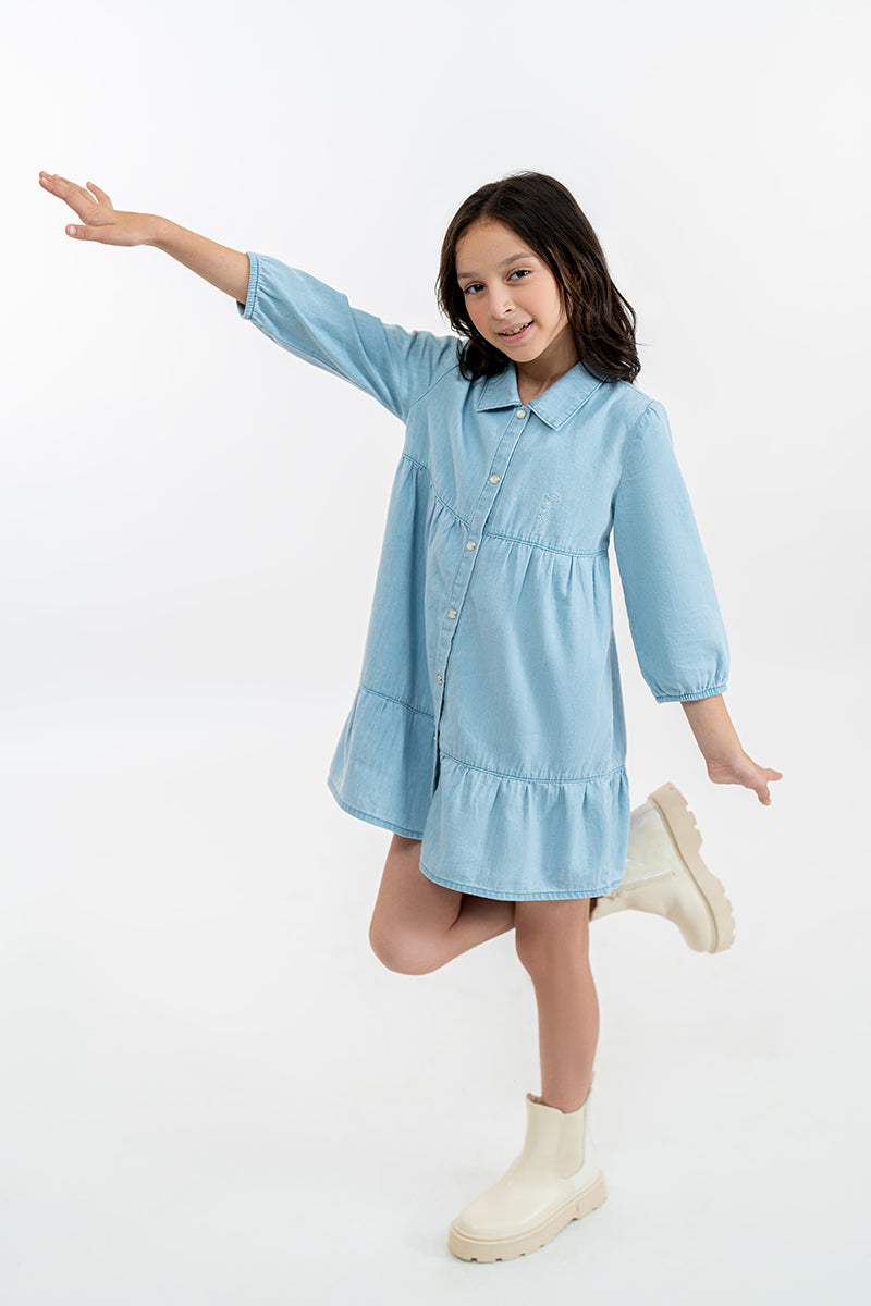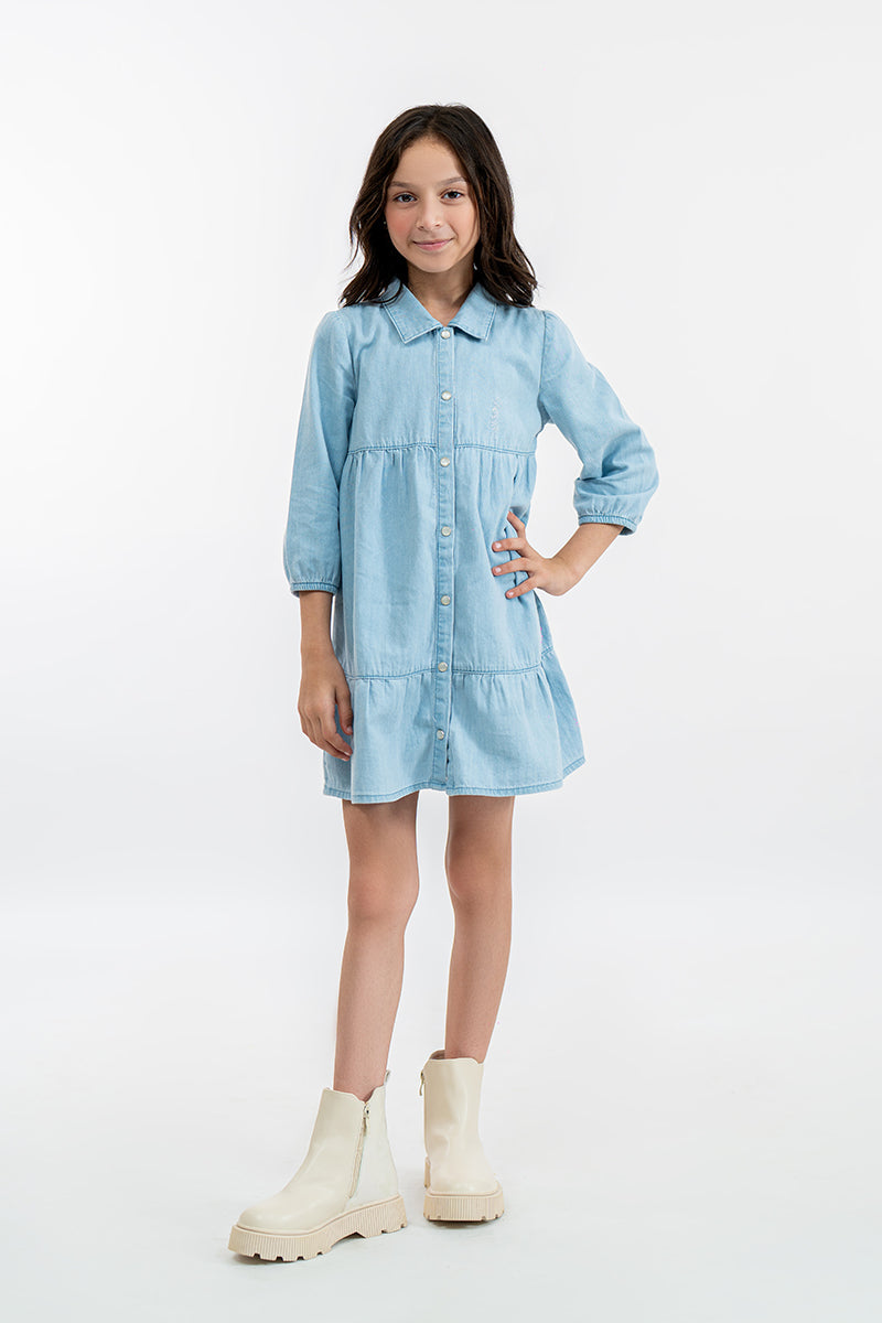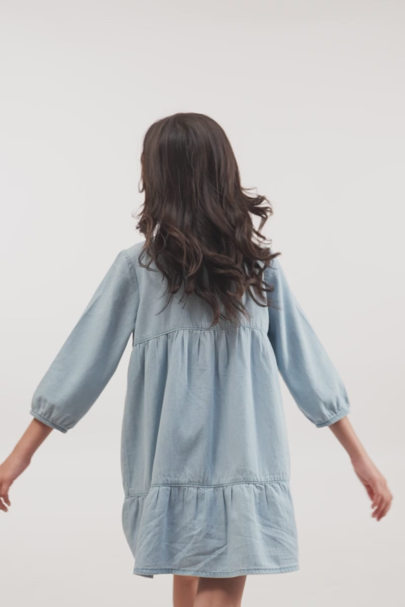 The Morning Mist dress is designed for playful days with a touch of polish. Crafted from lightweight, breathable denim, it offers all-day comfort. The dress features a classic collar, a button-down front, and three-quarter length sleeves. Its silhouette is a relaxed, tiered style with gathering, giving it a charming, casual feel.