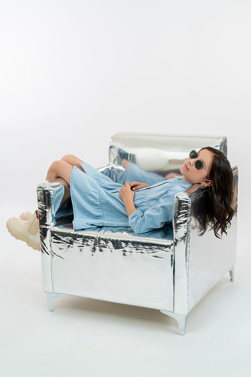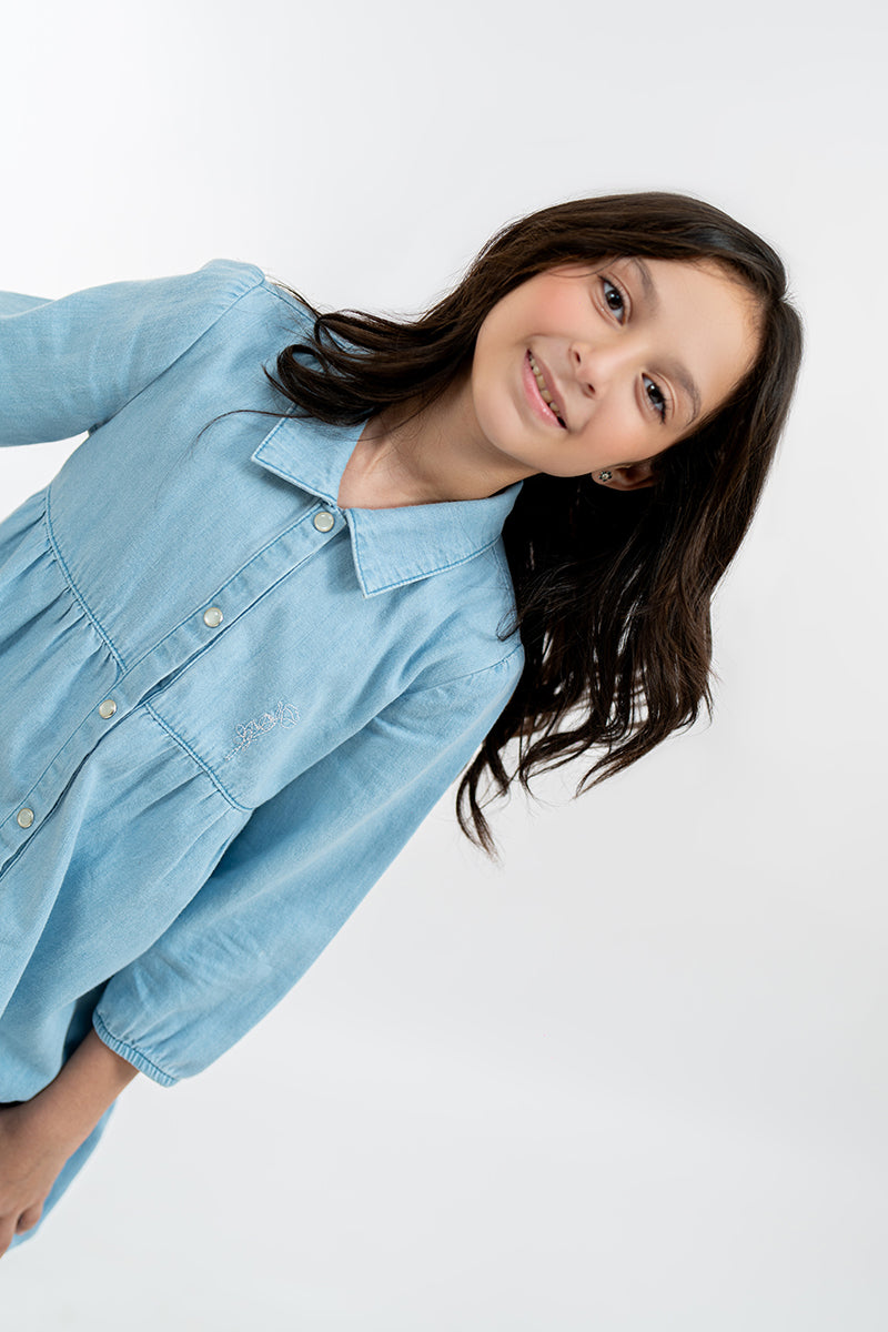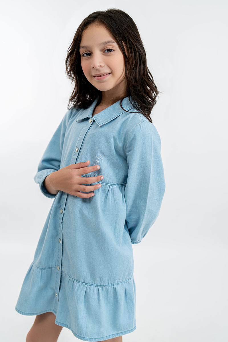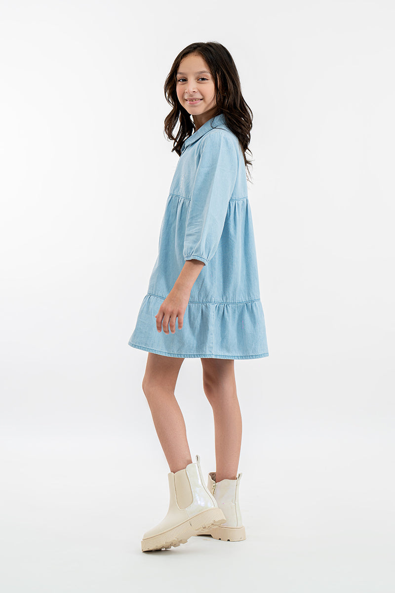 The Morning Mist dress is designed for playful days with a touch of polish. Crafted from lightweight, breathable denim, it offers all-day comfort. The dress features a classic collar, a button-down front, and three-quarter length sleeves. Its silhouette is a relaxed, tiered style with gathering, giving it a charming, casual feel.