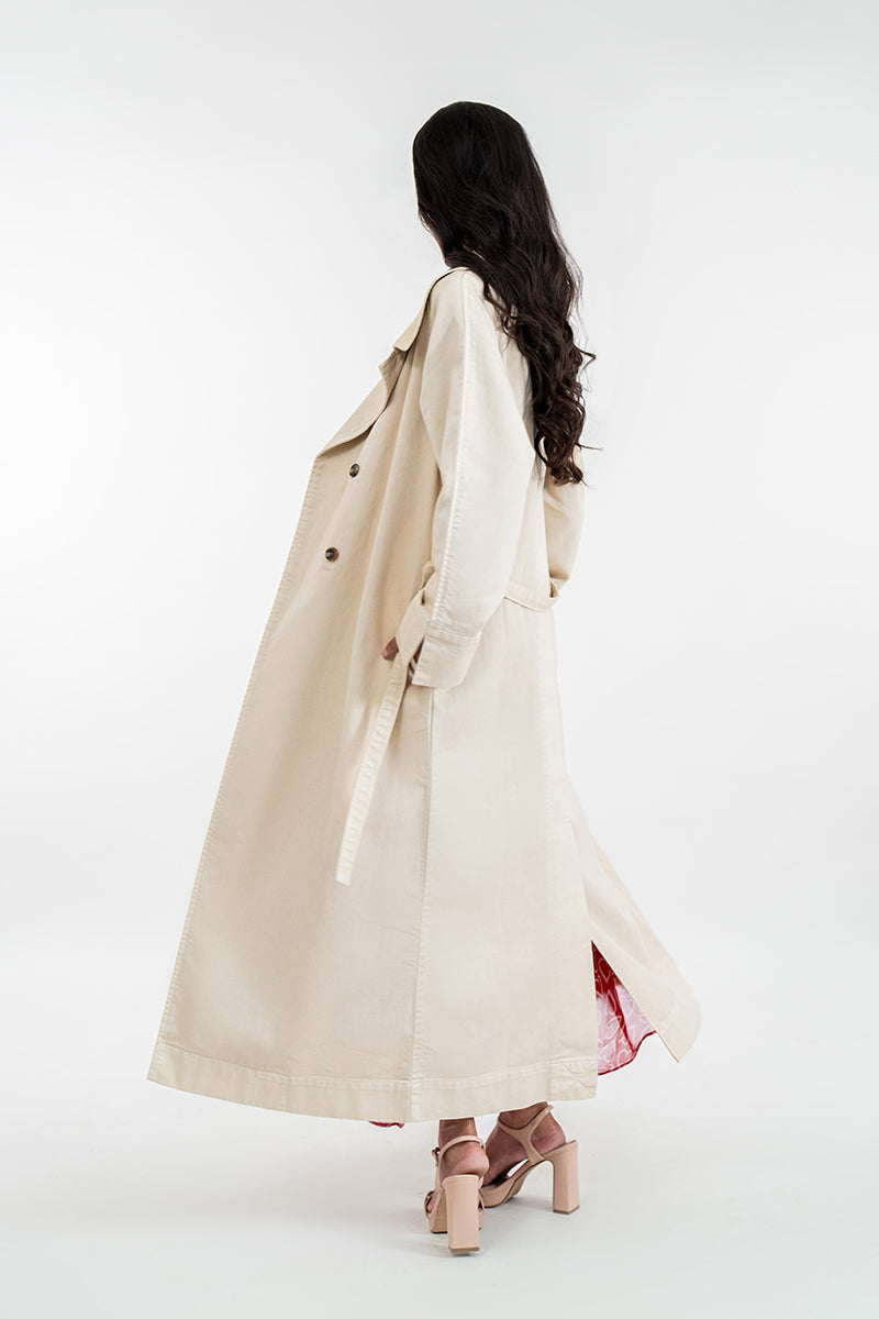 The Sand Dune Trench redefines sophistication. Crafted from premium, soft-toned denim, this coat features a tailored silhouette, wide lapels, and a classic double-breasted front. The denim texture adds a modern, utilitarian edge, allowing it to layer seamlessly and drape beautifully for enhanced movement.